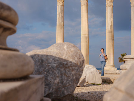 travel to ancient city of Side, Antalya coast of Turkey in tourist low season. Young tourist Asian woman is posing in front of temple of Apollo