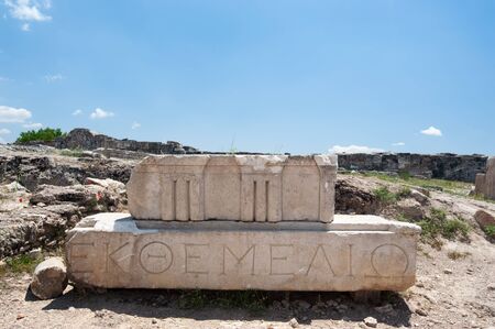 Fragments of ancient buildings, the ruins of the ancient city of Hierapolis. Stone blocks with traces of stone machining.