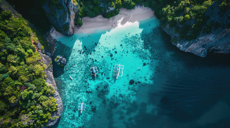 Top down aerial view of boats at cliff ocean shore, sand beach. Nature beauty of tropic mountain isle Palawan, El Nido Islands, Philippines, Asia. Epic summer landscape with vessels at rock coast
