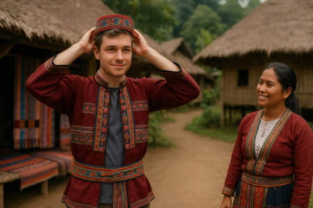 Young western man wearing traditional clothes with a local woman smiling in a tribal village in Southeast Asia