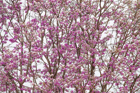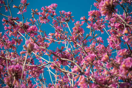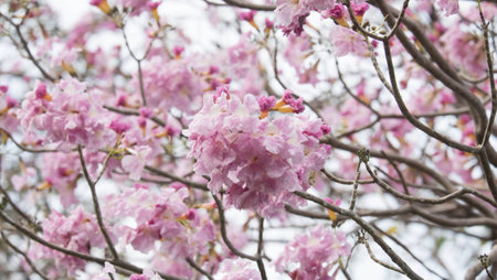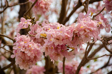 Beautiful branches of Pink trumpet trees or Tabebuia rosea flowers, Sakura pink cherry blossoms background.