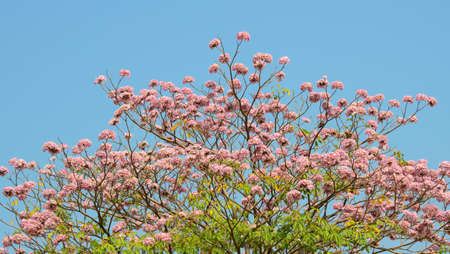 Pink trumpet tree blooming against the blue sky in april of thailand