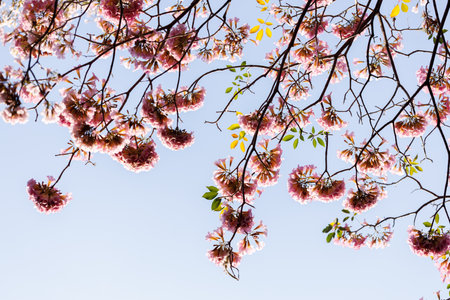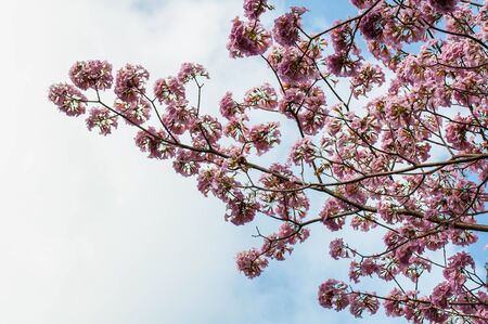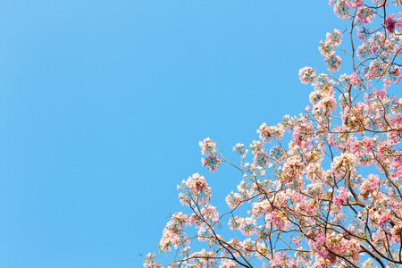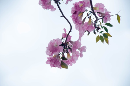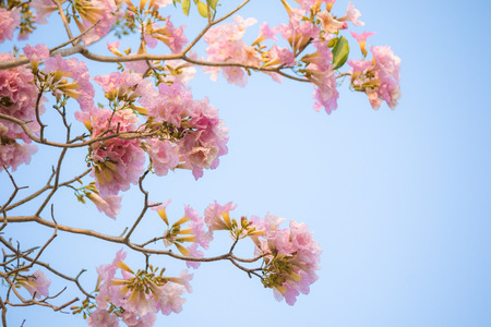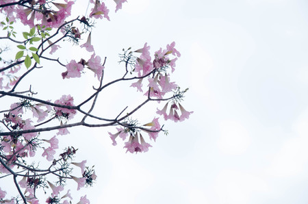 Tabebuia rosea flowers on sky with copy space. Sweet background