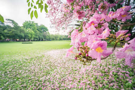 Pink trumpet tree flower in summer on ground, nature back ground