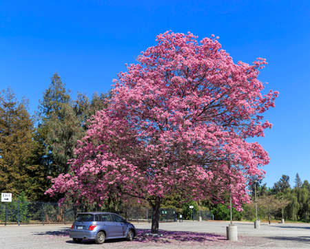Beautiful Tabebuia rosea tree or pink poui, and rosy trumpet tree pink flower blooming in garden