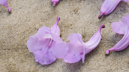 Fallen pink flower petals scattered all over the sand ground. Symbolize unhappiness, sadness, hopelessness and despair for a heartbroken human. Passed away in the middle of blooming season.