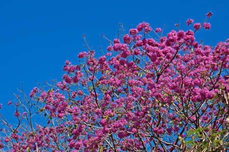 View of a Ipe tree with pink flowers on the central flower bed of Via Park at Campo Grande MS, Brazil. Tree symbol of the city.