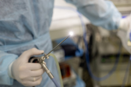 Male surgeon in blue scrubs and mask holding a complex medical instrument, possibly an endoscope, during a surgical procedure in a brightly lit operating room. A blurred medical assistant and patient are in the background.