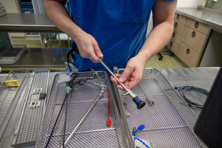 Close-up of the hands of surgeons washing and disinfecting medical endo-video equipment and instruments in a glass container. Endoscopy, laparoscopy, surgery. Operating room in a hospital.
