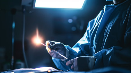A healthcare professional wears sterile gloves while holding a medical instrument, preparing for a surgical procedure in a clean operating room setting.