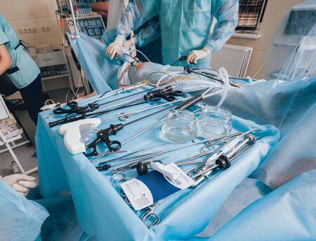Laparoscopic instruments on the operating table in the surgical room.