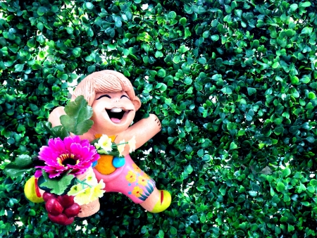 A girl doll hang on the green plant background