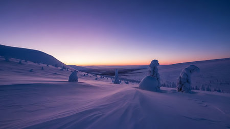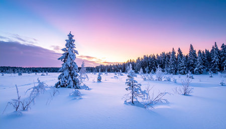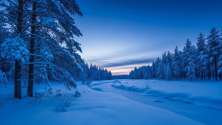A winter forest scene at twilight with snow covered trees and a gradient sky. Clear details and vibrant colors enhanc...