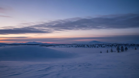 a captivating national geographic photo captures the serene beauty of a snow-covered field during a peaceful evening. the scene is painted in a delightful combination of light turquoise and light orange hues, reminiscent of idyllic rural landscapes. the image showcases a 20th-century scandinavian style, with a touch of elegance in light white and gold tones. the overall ambiance is enhanced by a subtle blend of