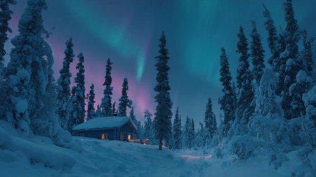 A cozy cottage surrounded by snow-covered trees is illuminated by vibrant northern lights, offering a tranquil winter atmosphere.