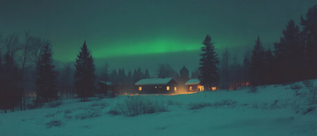 Northern lights illuminate a snowy landscape with cozy cabins at night