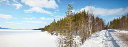 Empty old asphalt road (highway) through the pine forest. Snow-covered mountains. Winter landscape. Kola Peninsula, Polar Circle, Russia. Expedition, work, route, logistics, remote places, off-road