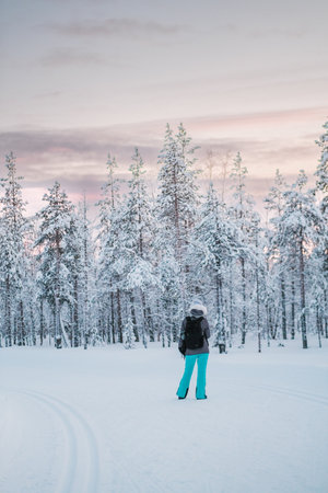 Back view of young girl walking in winter forest among snow covered trees in Lapland Finland