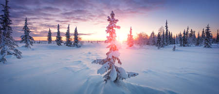 Beautiful winter landscape with snow covered fir trees and sunset sky.