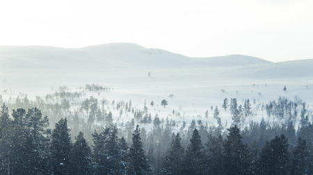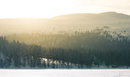 A beautiful winter landscape with snowy trees and mountains in a distance in central Norway.