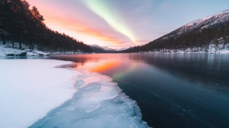 A serene winter sunset paints the sky in pastel hues over a frozen lake and a distant pine forest.