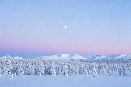 Winter landscape with snow covered trees and moon in the sky at sunset