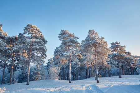 Beautiful atmospheric winter landscape. Snow covered trees in the forest in the sunlight. Winter nature background.