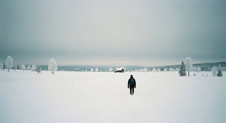 A lone figure walking through a snowy landscape, with trees covered in frost and a distant cabin visible