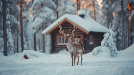 Noble deer in winter forest in Finnish Lapland against the background of a snow-covered forest hut