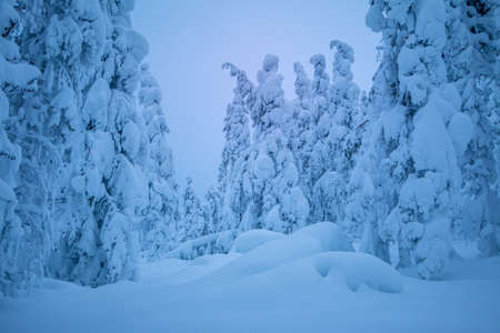 Lapland winter landscape. Snow figures of Salma mountain, the popular ski resort of Karelia. Salma is the famous spot for the seeing pines fully covered by snow at the winter and spring.
