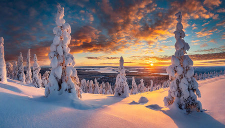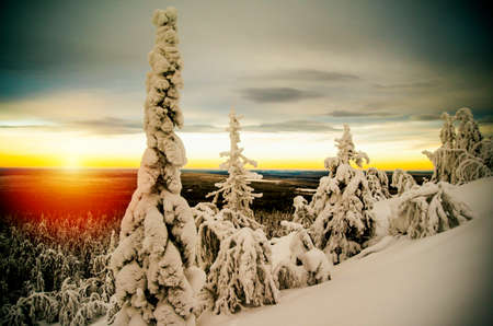 Forest covered with hoarfrost and snow in winter mountains - Sunset in Lapland