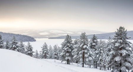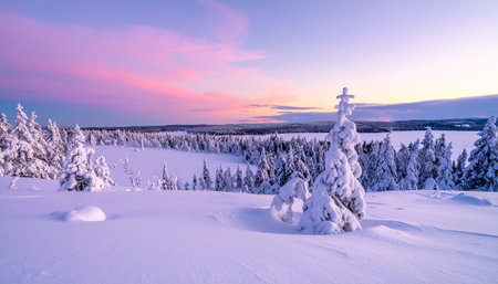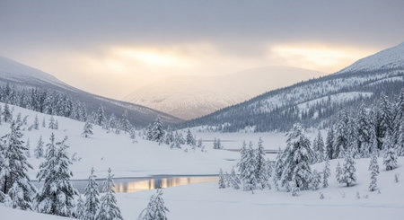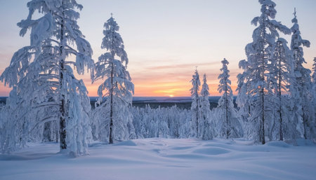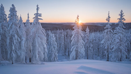 A breathtaking winter landscape featuring snow-covered trees under the soft light of sunrise. This peaceful scene invites tranquility and appreciation for nature