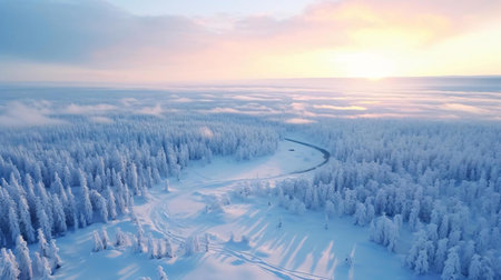 Generative AI : Aerial view of a winter road near Ruka Region of Lapland Finland