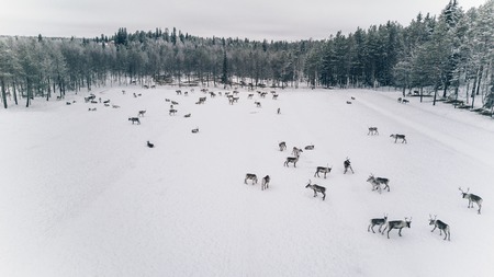 Aerial view of reindeer herd in snowy winter Lapland Finland