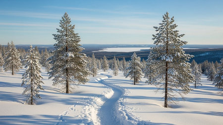 Scenic pine forest covered with snow at Oulanka National Park, Finland