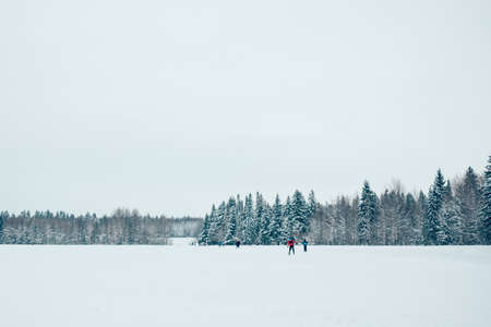 Clean view of a frozen lake with a small island with trees. Sognsvann lake in Oslo. Copy space