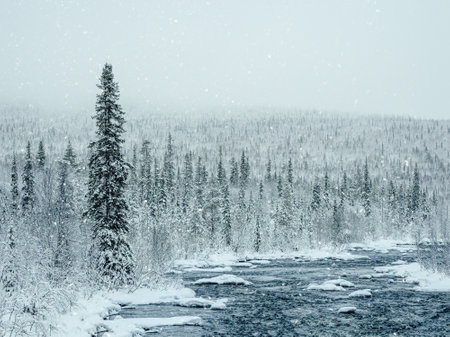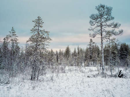 Wild winter snowy Northern forest with river on a polar day. Untouched pure nature. Karelia.
