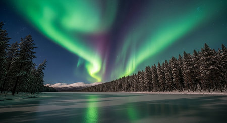 Discover the enchanting beauty of the northern lights illuminating a snowy pine forest, creating a breathtaking scene under a star-filled night sky.