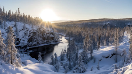 A serene winter forest at sunrise, with snow-laden pine trees and golden sunbeams piercing through the branches.