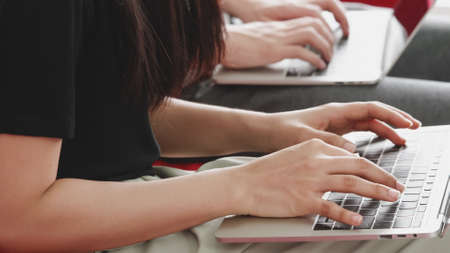 A close-up of a businesswoman typing on a laptop keyboard, sitting in a private office in a company where she is typing on an app to chat with a partner. Concept of using technology in communication.