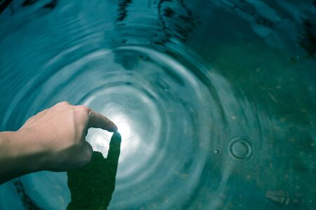 This image shows a hand touching the surface of a pool of water, creating ripples. The water is clear and blue, and the ripples are visible in the surface. The hand is positioned in the center of the image, with the ripples radiating outwards.