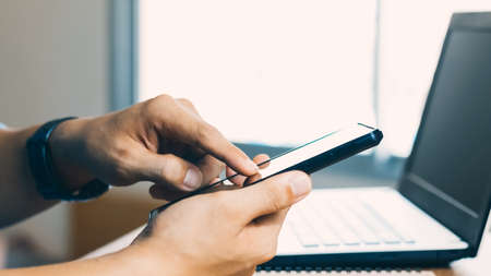 Cropped shot of female freelancer using smartphone while working with laptop on white circle table next to window