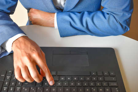 Male hand typing on laptop keyboard. Man work at home office, open notebook, close up view, selective focus.