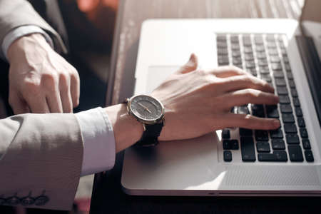 businessman typing on laptop. working at the laptop. in the hands of expensive watches out the window the sun is shining.