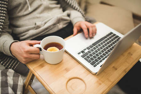 Young man laying in bad with laptop and cup of tea.