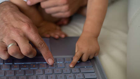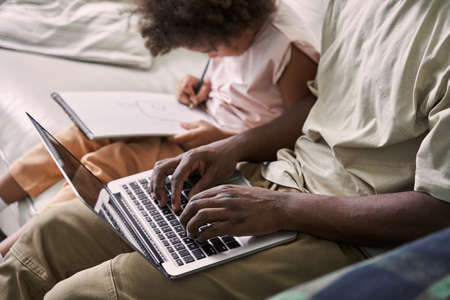 Father using laptop computer and browsing internet while his child girl daughter drawing