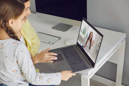 High angle of adult woman and girl having online meeting with medical practitioner while sitting at table at home