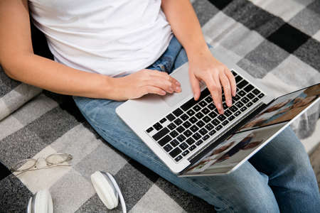 Female programmer writes program code on a computer laptop in the bed at home. remote work.