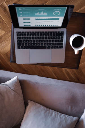 Meeting online, education. Remote working from home. Workplace in home office on sofa with laptop and devices. Concept of distance learning, isolation, female business, shopping online, conference.