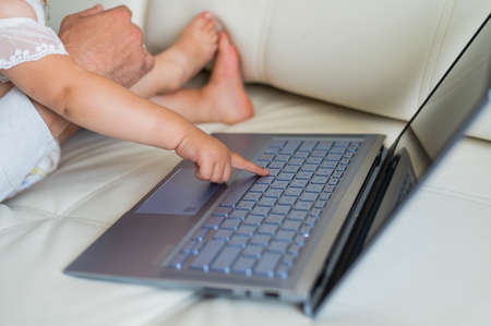 Little girl and caring father are watching cartoons on a laptop while lying on the couch at home. A man shows his little daughter photographs on a computer. Beloved daddy.